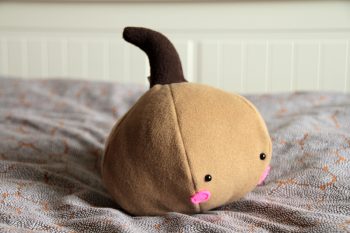 Peluche rembourrée en tissu marron clair en forme de grande citrouille.