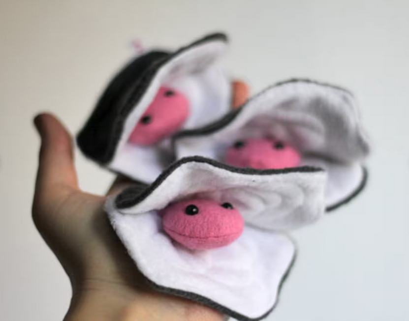 Peluche tout douce rembourrée en polaire rose, blanche et grise, en forme d’huître.