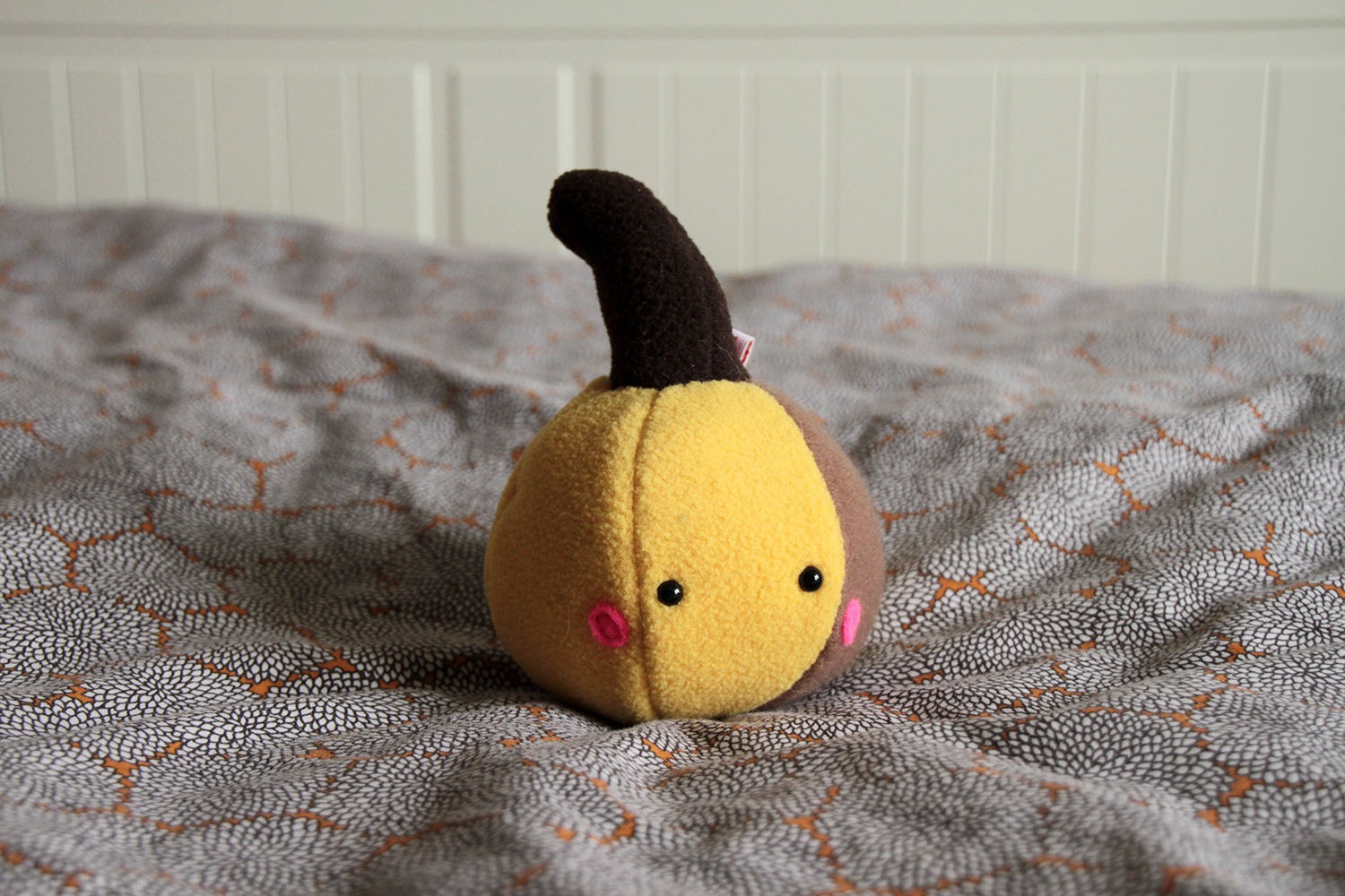 Peluche tout douce rembourrée en polaire jaune et marron en forme de petite citrouille.
