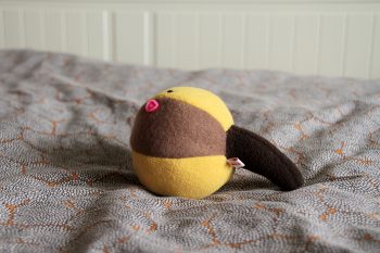 Les joues sont en feutrine rose fuchsia et les yeux sont des yeux de sécurité en plastique noirs.
