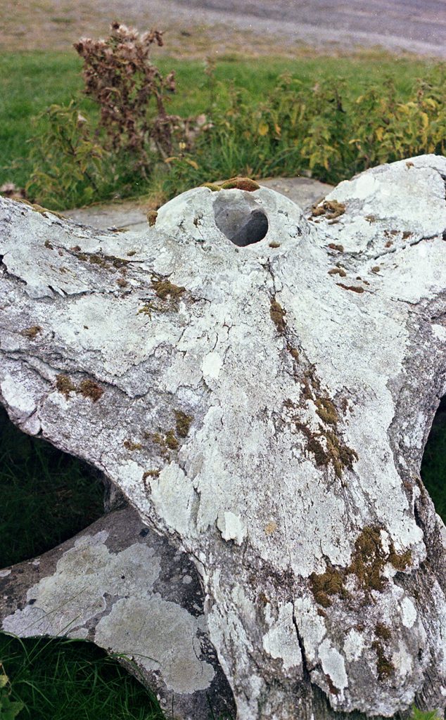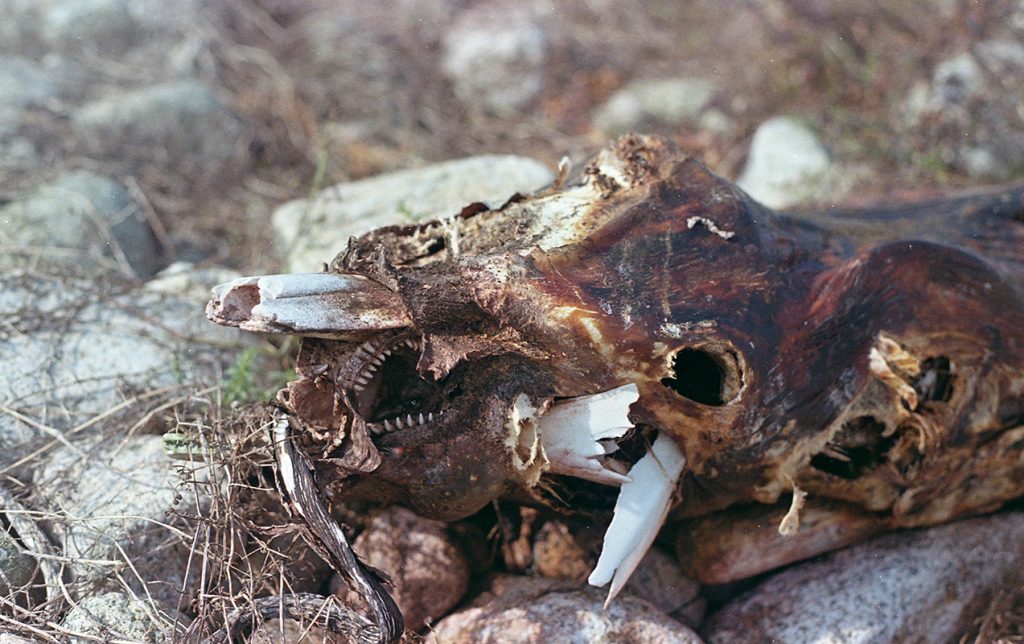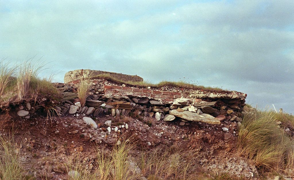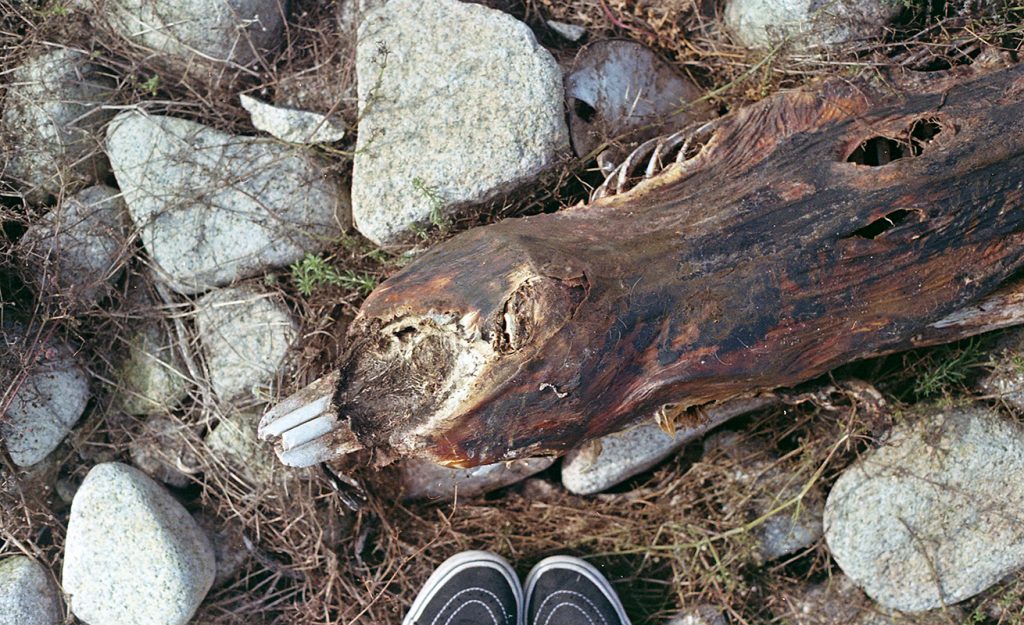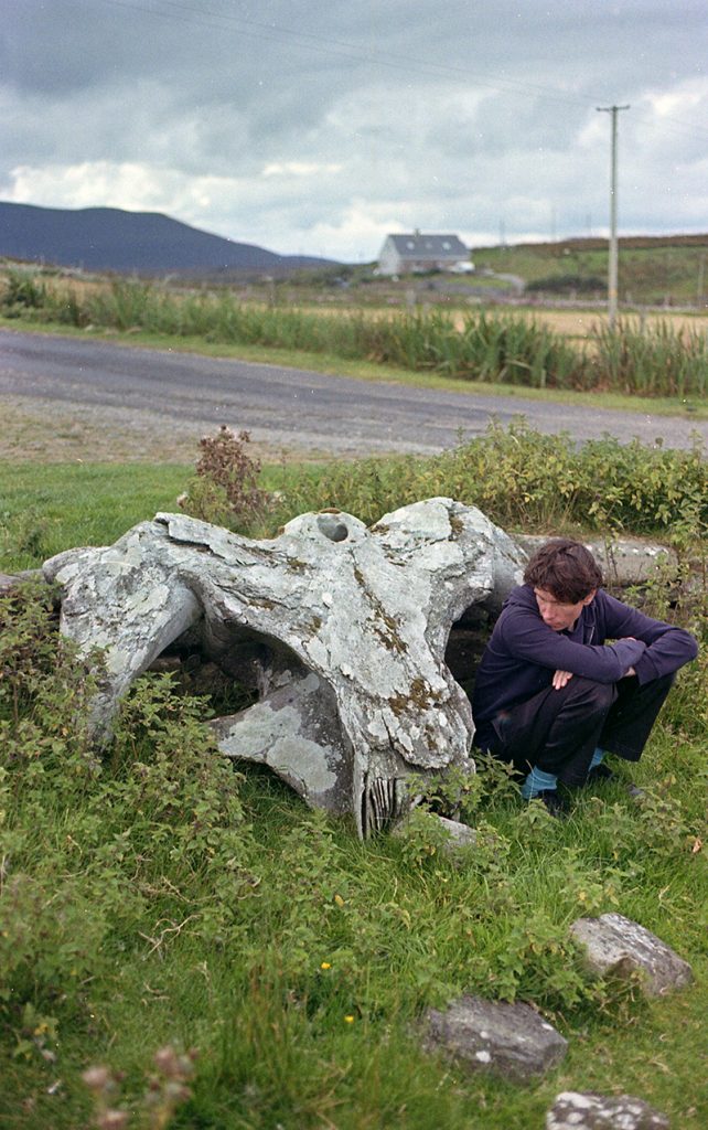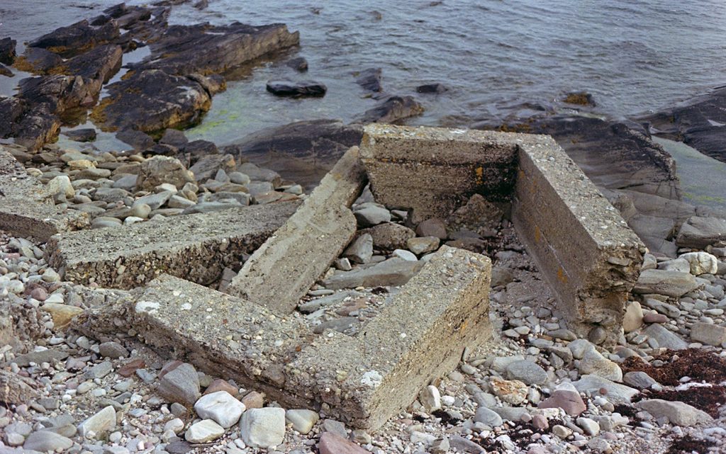 Sur une plage nous trouvons un muret en pierre dont la base est tenue par onze crânes de globicéphales (Globicephala melas). La structure osseuse de chacun a été très fragilisée par le milieu et les intempéries. Ils sont placés là depuis au moins plusieurs années.