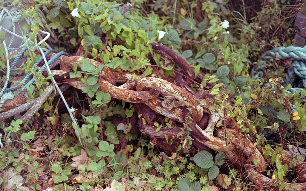 De nombreux fragments d’objets en acier sont encore visibles. Ce fragment pourrait être l’extrémité d’un harpon, arme projetée dans la chair des baleines. Mes pieds donnent une idée de la taille.