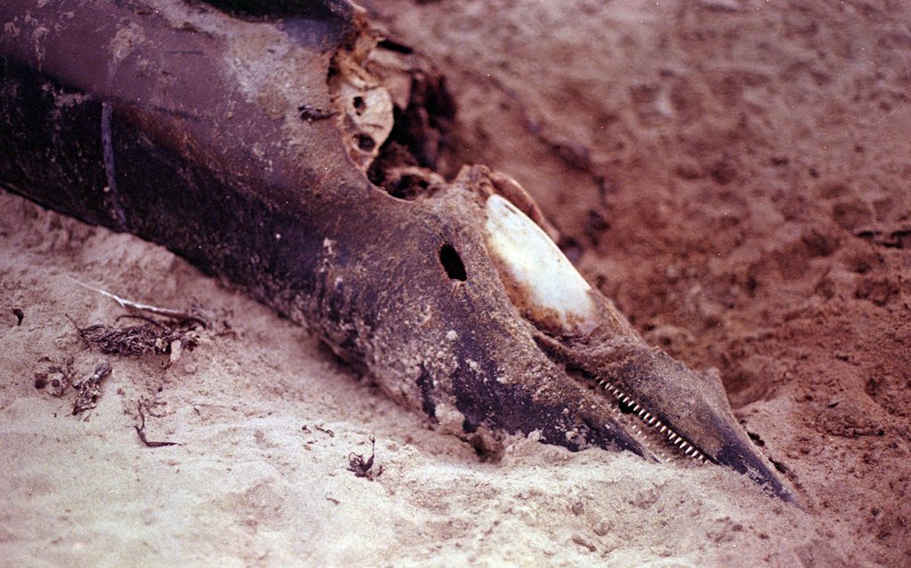 Un petit cétacé (dauphin ?) échoué dans le sable de la plage de Tullan.