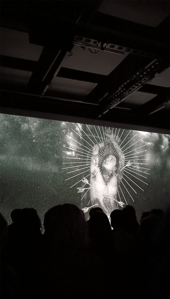 « Our Joyful Endings is a visual poem focused on the trans-masculine experience; the liberation and pleasure that a non-normative body gains within the safe framework of the film medium is unsurpassable, however much it may slide into expected poetic and well-trodden visual patterns (black-and-white photography with overlaid text, occasional) and culturally accessible motifs (e.g. the martyr saint’s pose of St. Sebastian or, at the complete opposite end of that spectrum, corresponding with transphobes on a gay hook-up app). »