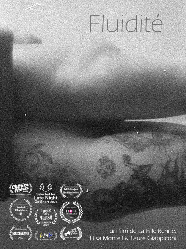 La Fille Renne – photographer and tattoo artist -, Laure Giappiconi – actress and author – and Elisa Monteil – sound designer and performer -, form a film-making collective. Their research revolves around explicit representations of desire and takes various forms, at the crossroads of dissident poetry and visual performance. They are committed to highlighting bodies, identities and sexualities that are outside the usual normative representations. They develop a singular aesthetic, shooting exclusively on 35mm film or Super 8, fixing timeless, feminist and queer images in these layers of chemistry. In each film, the sound creation allows us to plunge a little further into intimacy and disorder.